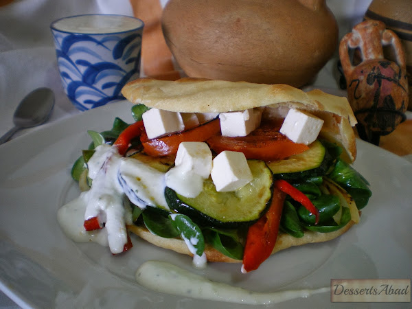 Rellenamos las pitas con las verduras asadas, los canónigos y el queso Feta.