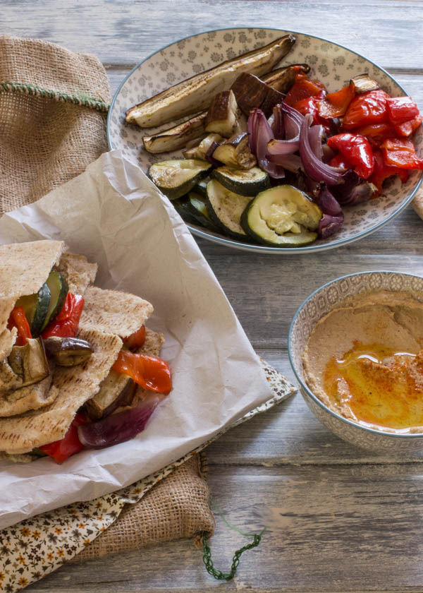 De verdad que me gustaría que todas las comidas y cenas más o menos rápidas tuvieran el mismo resultado tan rico que este pan pita con verduras asadas y hummus. La combinación de sabores que ofrece este pequeño manjar es increíble. Es una semi receta, ya que a penas tenemos que hacer nada, eso sí no hagáis trampa y que el hummus sea casero roque no tiene nada que ver y os dará un mejor resultado.