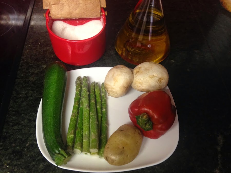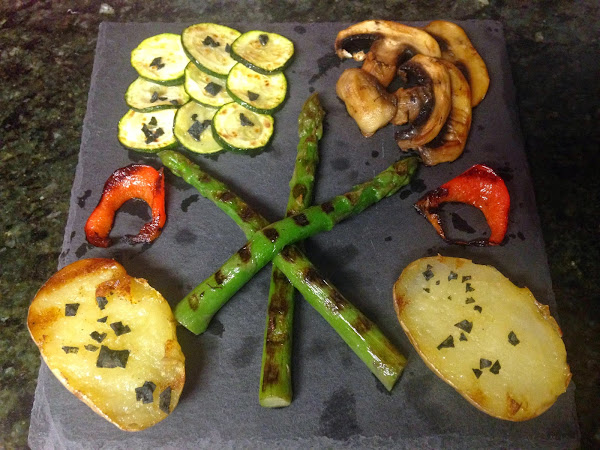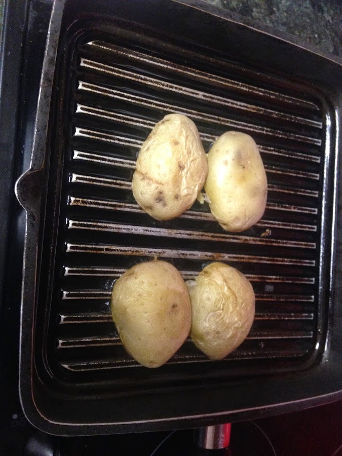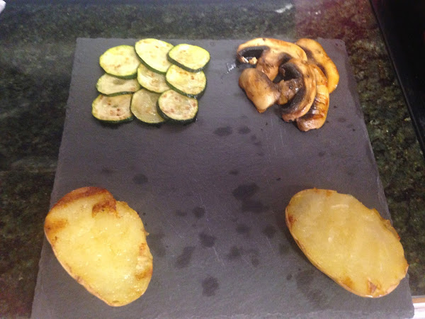 Las patatas las abremos previamente cocido en el microondas durante 10 minutos. Las pasamos 2 minutos por la parrilla.