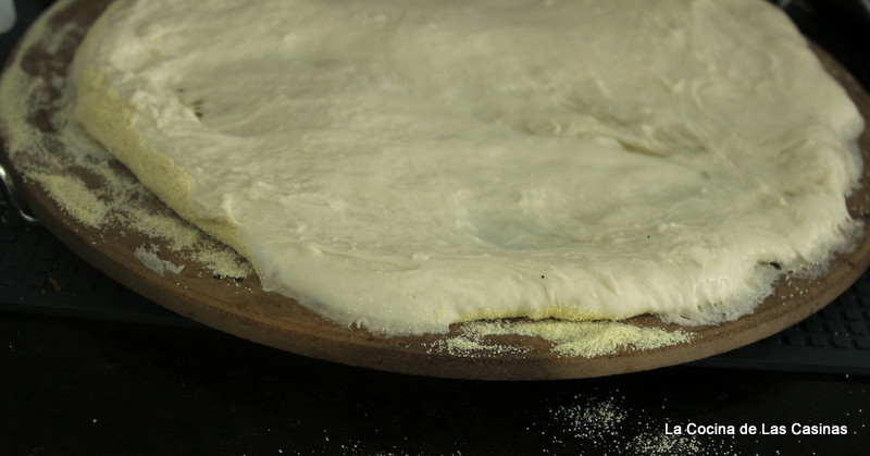 Extiendes la masa en una bandeja de horno cubierta de papel vegetal o como en mi caso en una piedra de hornear caliente que has cubierto de sémola de trigo.