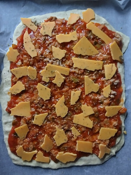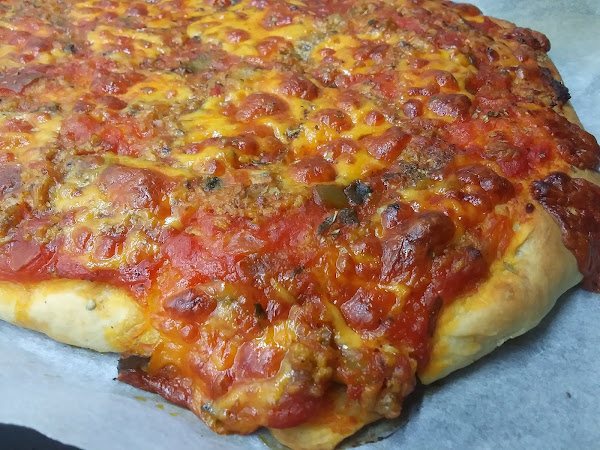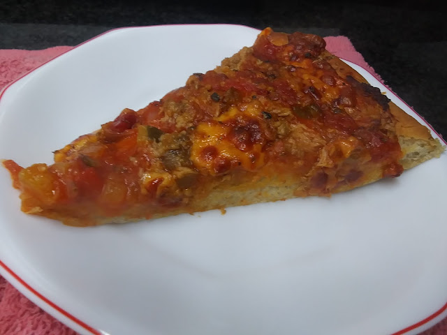 Esta receta de masa de pizza, la encontré en la web Aptc y me llamó la atención lo fácil que era por las medidas en vaso. Indica, que si la dejamos reposar 15 minutos obtendremos una masa fina y si la dejamos unas dos horas, la masa tendrá mayor espesura. En mi caso la dejé 15 minutos, pero al ponerle el relleno no la horneé inmediatamente y en ese tiempo la masa siguió subiendo y quedó una masa muy esponjosa tipo miga de pan muy suave. Lo mejor es que al día siguiente, con la masa reposada está incluso más buena. La próxima vez intentaré probar a hacerla fina, a ver qué tal.