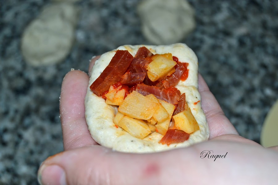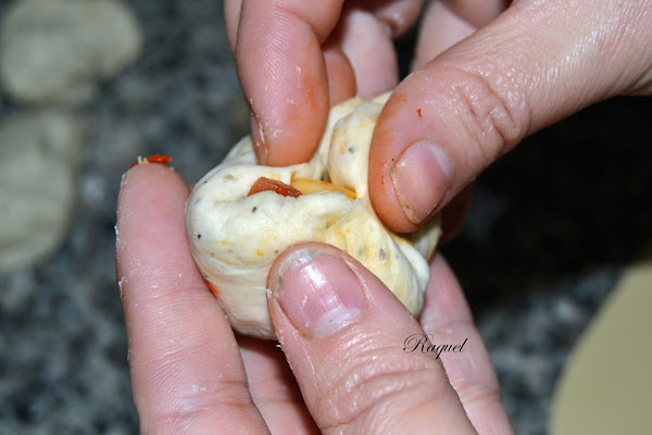 Aplanar con la mano la bola y rellena con el relleno preparado, importante que quede bien llena.