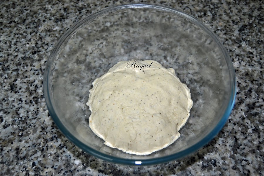 Formar una bola y tapar con un paño de algodón y dejar reposar la masa en un sitio cálido, yo la dejo dentro del horno a 35 grados y apagado, durante una hora y media.