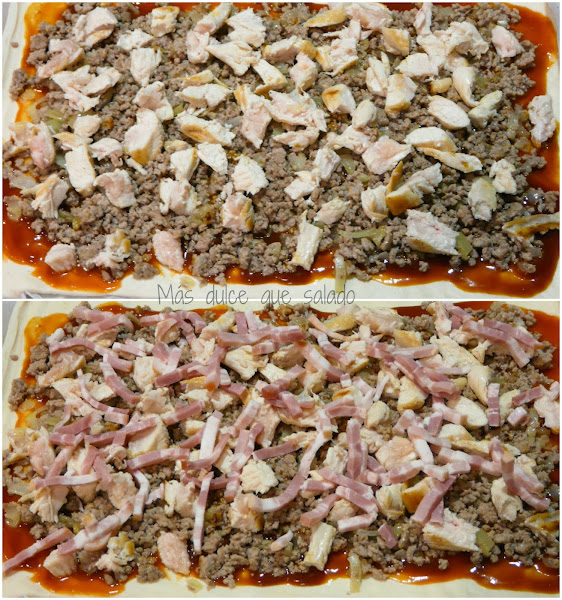 Ponemos encima la carne picada, luego la pechuga de pollo , encima las tiras de bacon y cubrimos con el resto de la salsa barbacoa.