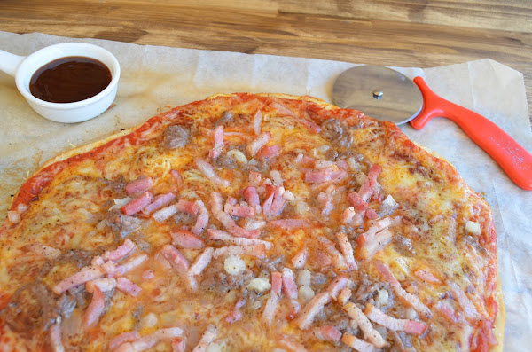 Ponemos tomate frito y extendemos por toda la pizza, encima ponemos salsa barbacoa y la mezclamos un poco con el tomate, no te pases con la salsa barbacoa, la cuestión es que tenga sabor pero que no mate los demás sabores de la pizza, carne, beicon.......