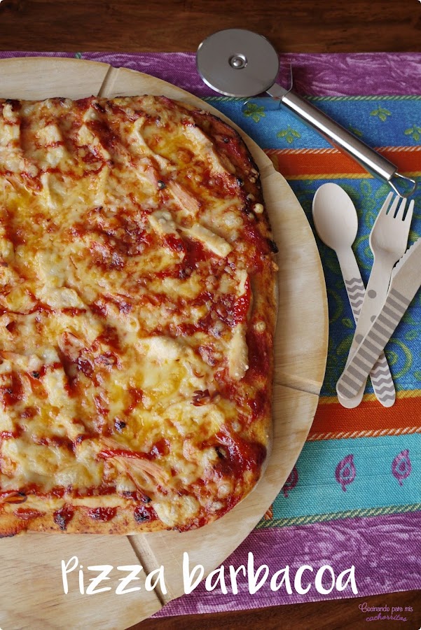 La de hoy, sin embargo, lleva poca verdura. Era una petición reiterada del cachorrito mayor que siempre quiere pizza barbacoa. La preparé con pollo, pero puedes sustituirlo por el tipo de carne que prefieras; a mí el sabor intenso de la salsa barbacoa me casa mejor con carne de ave que con carnes rojas, pero eso ya es cuestión de gustos.