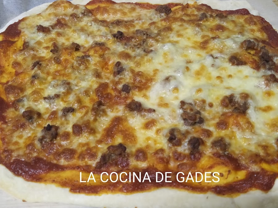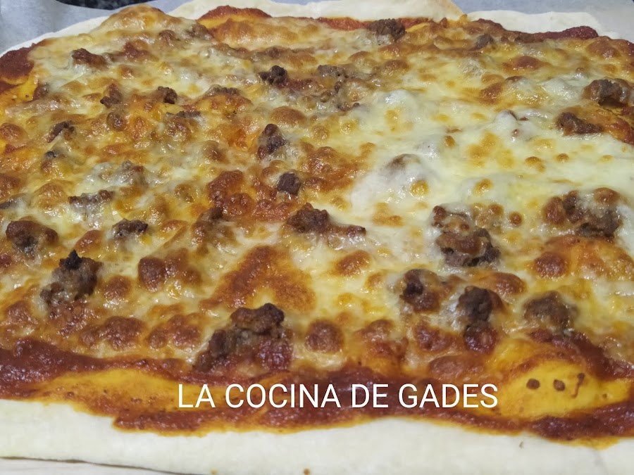 Montamos la pizza echamos en la masa de pizza la salsa barbacoa casera la carne picada y cubrimos con el queso, metemos al horno precalentado 200° hasta que el queso se dore.