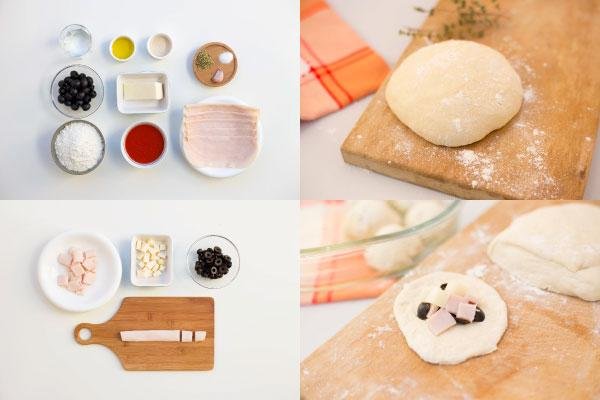 Separa la masa en 12 porciones lo más igualadas posibles. Toma cada bola con la mano y aplástala, rellena con los ingredientes que has cortado antes. Cierra la masa con los dedos y dale forma de bola de nuevo. Pon cada bola en la fuente con la unión hacia abajo. Repite con las 12 bolas. Reposa todas las bolas hasta que doblen su volumen. Precalienta el horno a 250ºC.