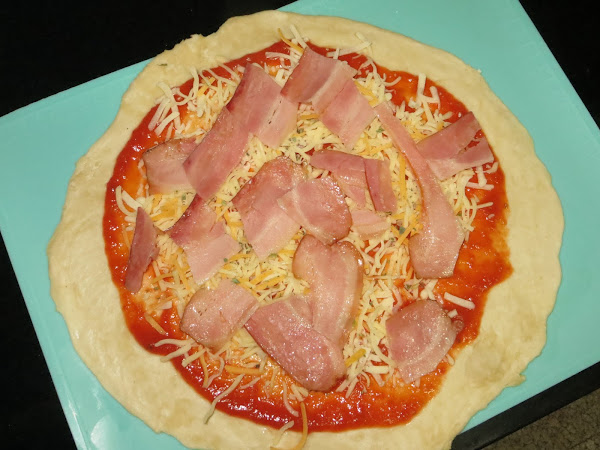 Una vez que está fermentada la volvemos a amasar para liberarla del aire que se haya formado y la estiramos con ayuda de un rodillo. Le damos forma redonda y comenzamos a rellenarla, echamos primero el tomate a mi me gusta el casero, pero puede ser frito, luego le añadimos los quesos rallados y por último el bacon yo lo cocino un poco en la sartén o en el microondas para que se quedé bien cocinado. Añadimos el orégano por encima y cerramos como si fuera una empanada.