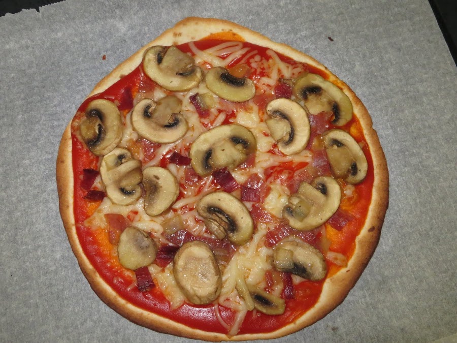 Por otra parte, colocamos las piadinas en una bandeja de horno y echamos por encima un par de cucharadas de tomate frito, queso rallado, los champiñones cocinados y el jamón en tocos. Metemos al horno de 8 a 10 minutos hasta que veamos que se empiezan a cocinar los bordes. Sacamos y colocamos las aceitunas y ya están listas para servir en la mesa.