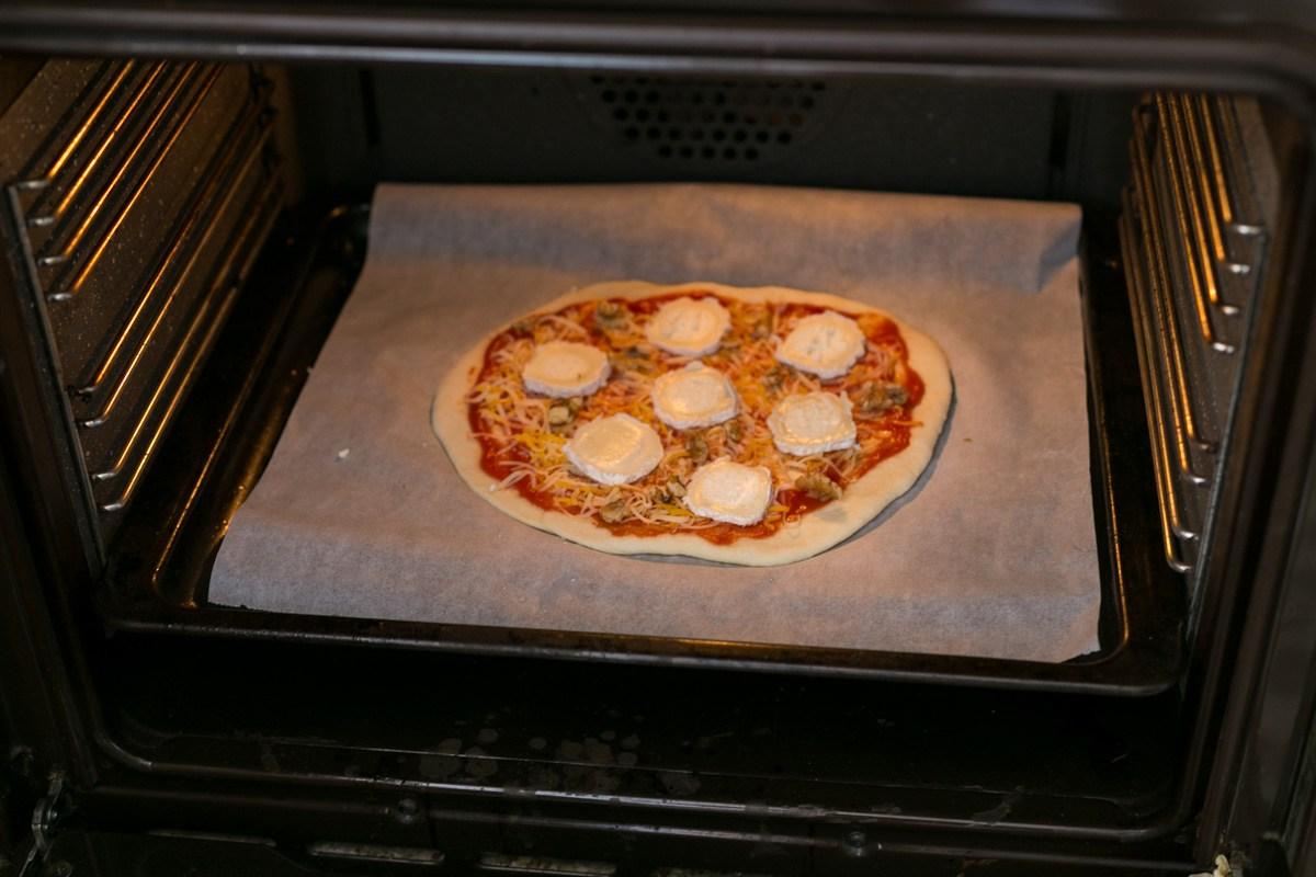 Colocar la bandeja con la pizza bien abajo en el horno (casi rozando la superficie de abajo) y hornear a 250 grados durante 5 minutos (esto para que la pizza quede crujiente por abajo), luego colocar la bandeja más arriba y terminar de cocinar la pizza durante 5 a 7 minutos o hasta que se derrita el queso y los bordes de la masa se doren levemente.