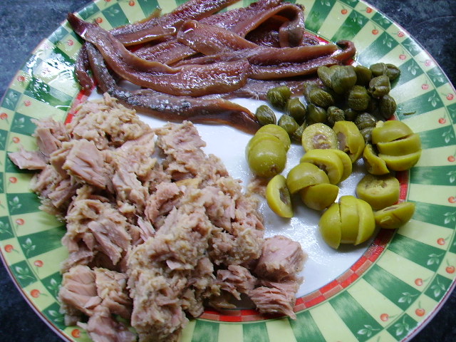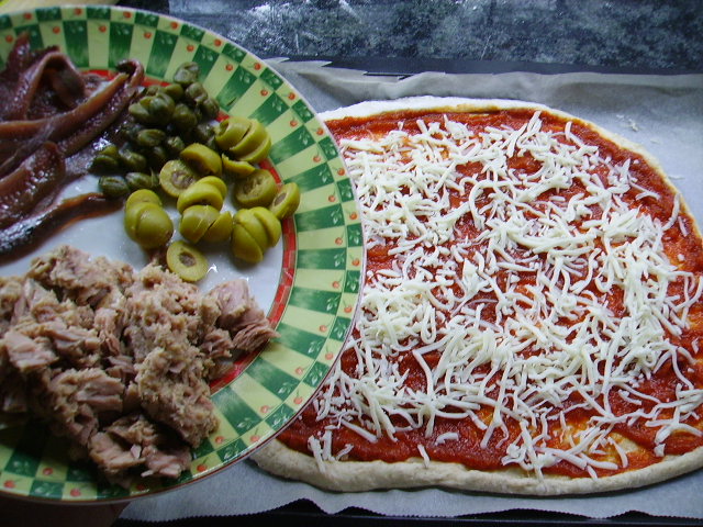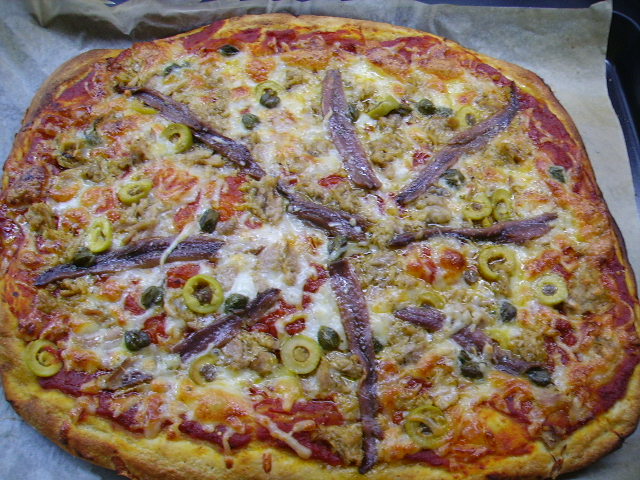 Y los ingredientes para rellenar esta nueva pizza son Anchoas, Atún, Aceitunas y Alcaparras al gusto.
