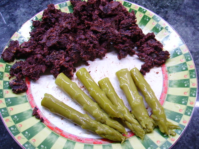 13.- Decoramos con los espárragos. Aunque suelo salir a cogerlos, como hace tiempo que no llueve, hay que recurrir a las conservas.