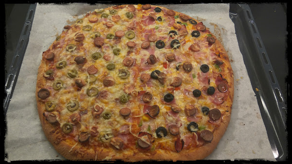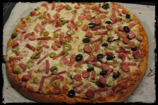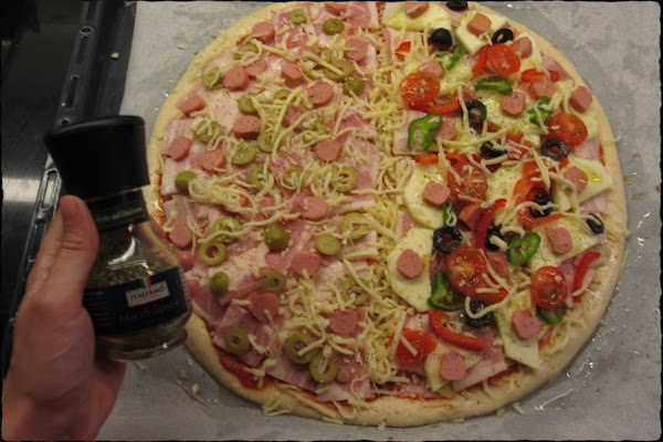 -(estos ingredientes un poco a vuestro gusto)Jamón york, champiñones, bacon, aceitunas, pimiento verde...etc.