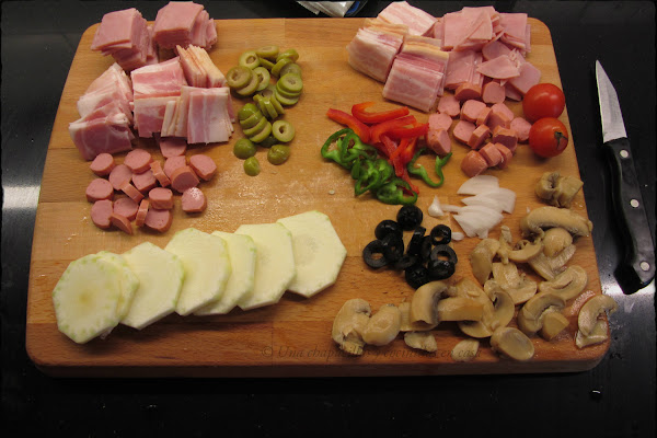 Cortar los ingredientes al gusto, yo suelo hacer mitad y mitad, en cada lado ingredientes diferentes. Al final echar lo que mas nos guste. Yo por ejemplo para esta usé jamón york, bacon, salchichas, calabacin, tomates cherry, pimientos, cebolla, champiñones...etc vamos lo que podeis ver en la foto.