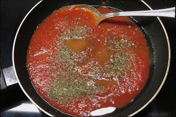 Poner un poco de aceite de oliva en una sartén y verter un poco de tomate triturado. La cantidad es un poco a ajo, yo pongo mas o menos para cubrir la pizza. Echar una 1 cucharadita de azúcar, una pizca de sal, oregano, albahaca, un pelin de ajo en polvo, y pimienta negra en polvo.