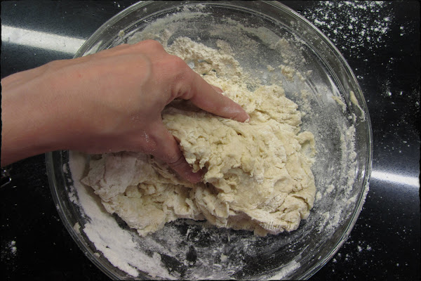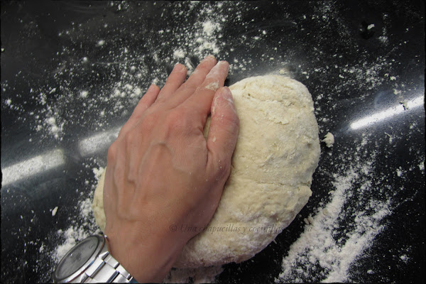 Amasar sobre la encimera espolvoreada con harina hasta que quede una masa suave, unos 5 minutos mas o menos.