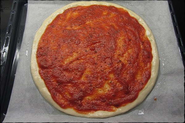 Extender la salsa de tomate e ir colocando los ingredientes al gusto, con las capas de queso mozzarella e ingredientes que querais.