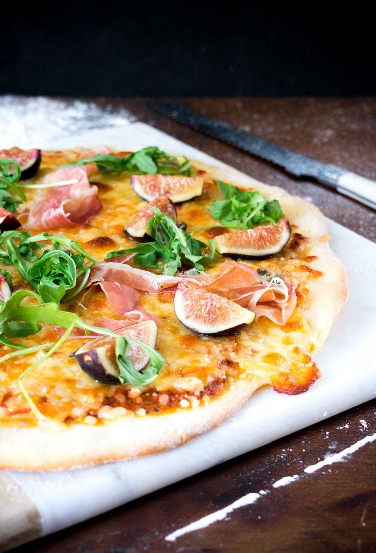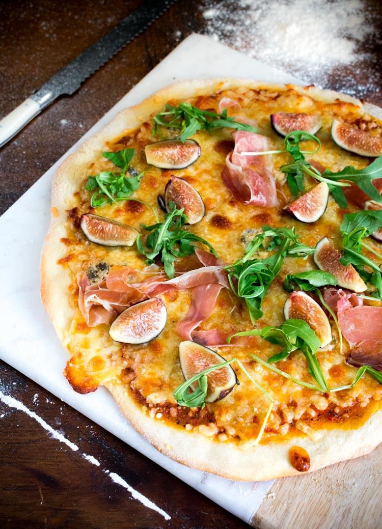 La receta es la base de la pizza. Para esta ocasión yo la preparé con higos, queso azul, prosciutto y un poco de arúgula. ¡Una combinación exquisita! Pruébala, o prepárala con los ingredientes finales que a ti mas te gusten. Puedes usar todo tipo de verduras, quesos, carnes frías e incluso carnes y mariscos.