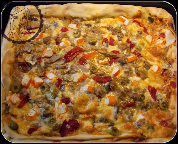 Estira la masa con un rodillo, ponla sobre la bandeja del horno, pon la salsa de tomate sobre la masa y añade el resto de los ingredientes. La de la foto lleva: palitos de cangrejo, atún, pimiento morrón, aceitunas, queso azul y mozzarella.