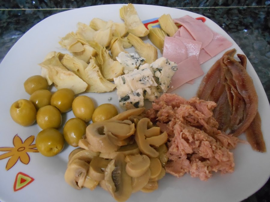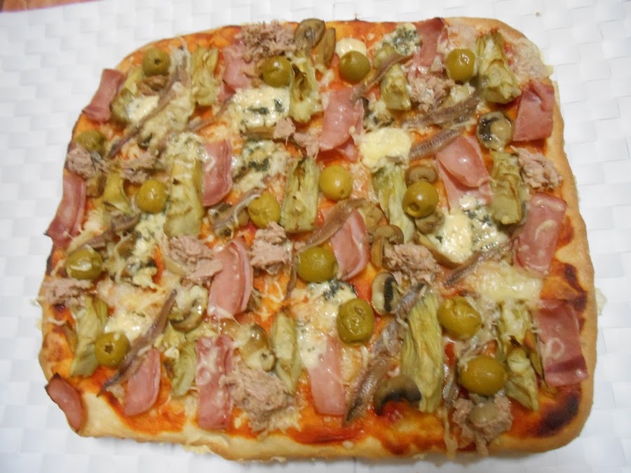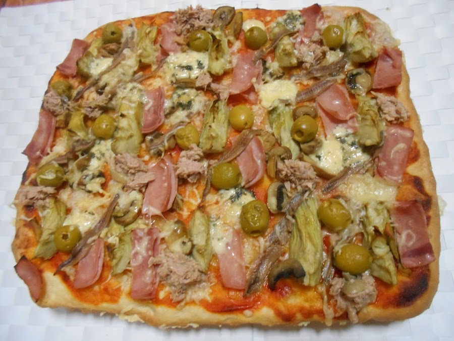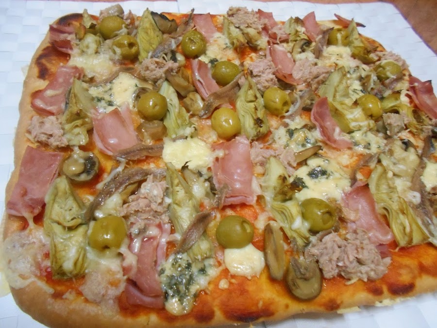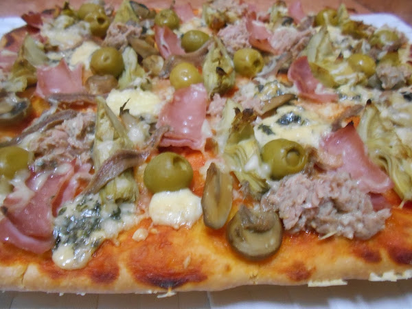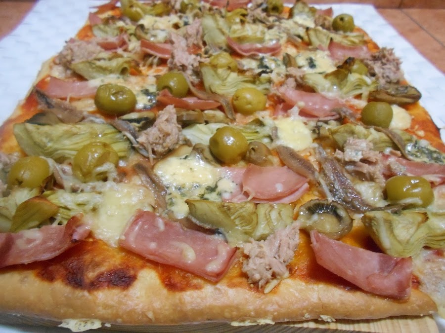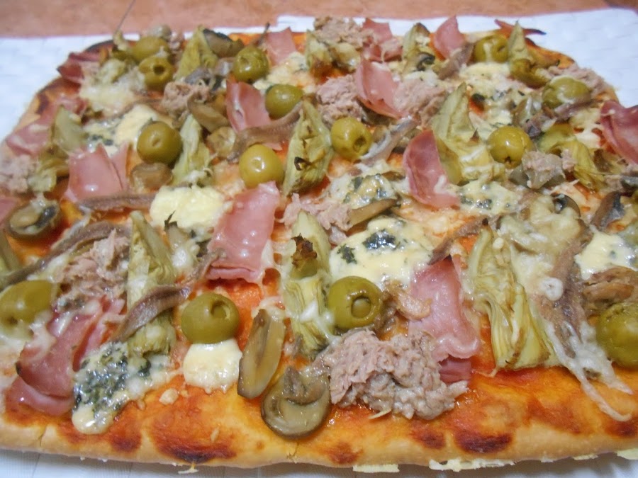 Al gusto. En mi caso: alcahofas, champiñones, atun, anchoas, jamon york, aceitunas, queso roquefort, tomate frito, queso rallado
