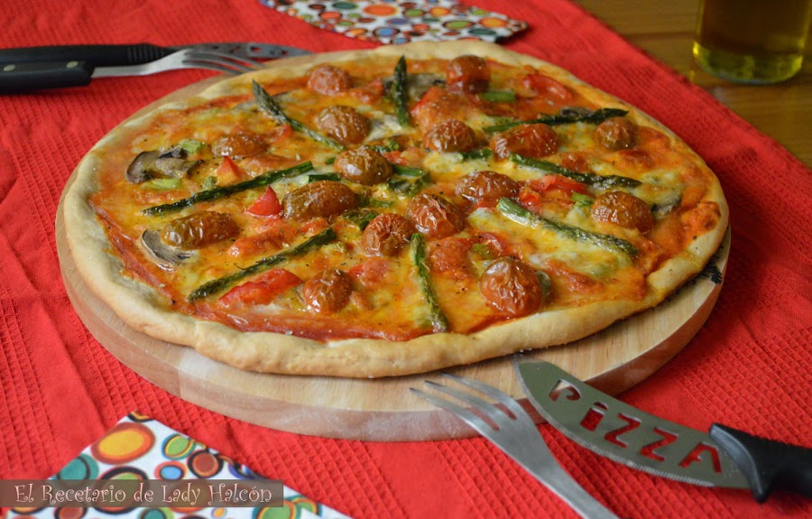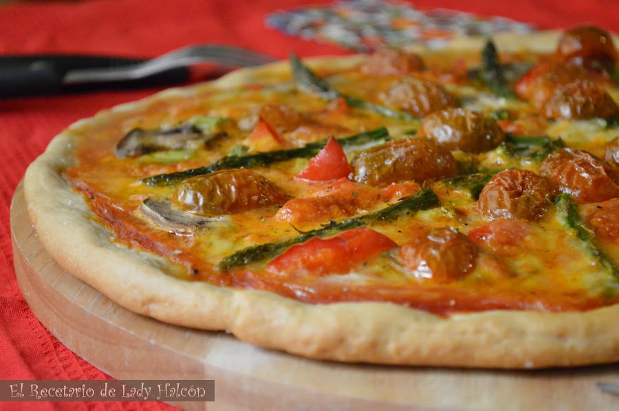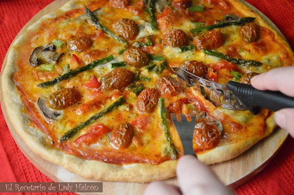 Y así es como este año hemos abierto la veda del horno, por que la del otoño ya la abrimos la semana pasada con un rico cocido jaja. Esta vez decidimos ser un poco más buenos y nos decantamos, bueno, mejor dicho me decanté (por que el cocinillas quería echarle pavo...), por una pizza vegetariana de masa fina ¡y qué gran acierto! Casi sin pensar en los ingredientes hemos conseguido una mezcla muy sabrosa y suave, de las que te saben diferente a cada bocado y te la acabas casi sin darte cuenta.