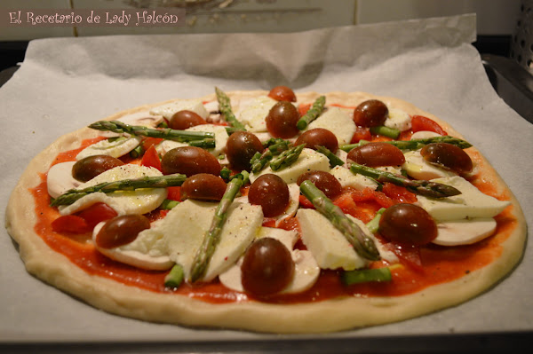Continuamos añadiendo la mozzarella cortada en rodajas, los tomatitos cherry cortados por la mitad y las puntas de los espárragos. Antes de meter la pizza en el horno salpimienta y vierte un chorro de aceite de oliva por encima.