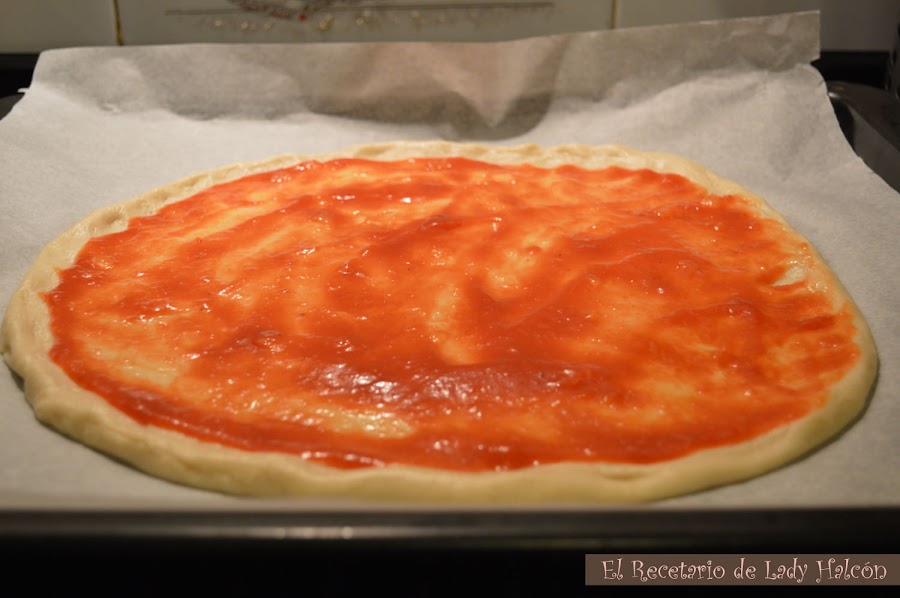 Pasado ese tiempo pon a precalentar el horno a 200ºC, calor arriba y abajo.Cubre la bandeja del horno con una hoja de papel para hornear y estira la masa con la ayuda de un rodillo o con las manos, dejando un pequeño reborde por todo el contorno. Añade tomate triturado cubriendo toda la superficie de la masa.