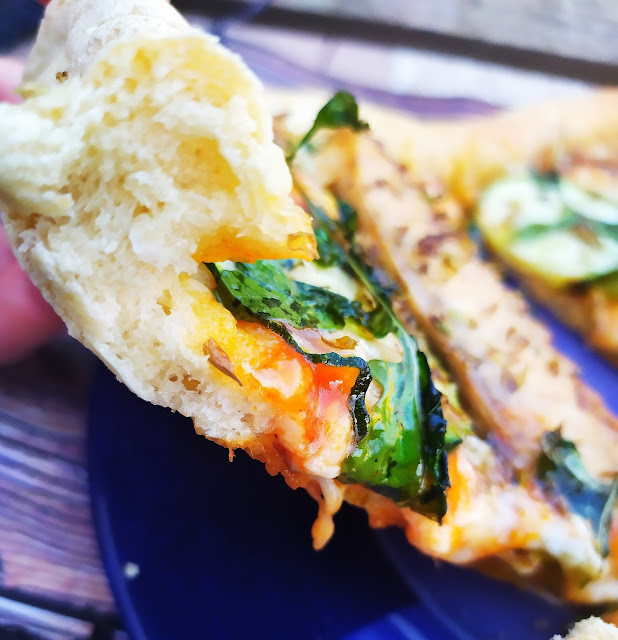 El blog al que me refiero es ApfelStrudel Kuchen y la receta que le robado vilmente es la de esta deliciosa masa para pizza. En casa nos ha encantado, es una masa suave, tipo pan, que tiene mucho sabor y está para babear. El relleno lo podéis hacer como queráis, en mi caso le puse lo que tenía por casa, un poco de calabacín, caballa, pimiento, rúcula....