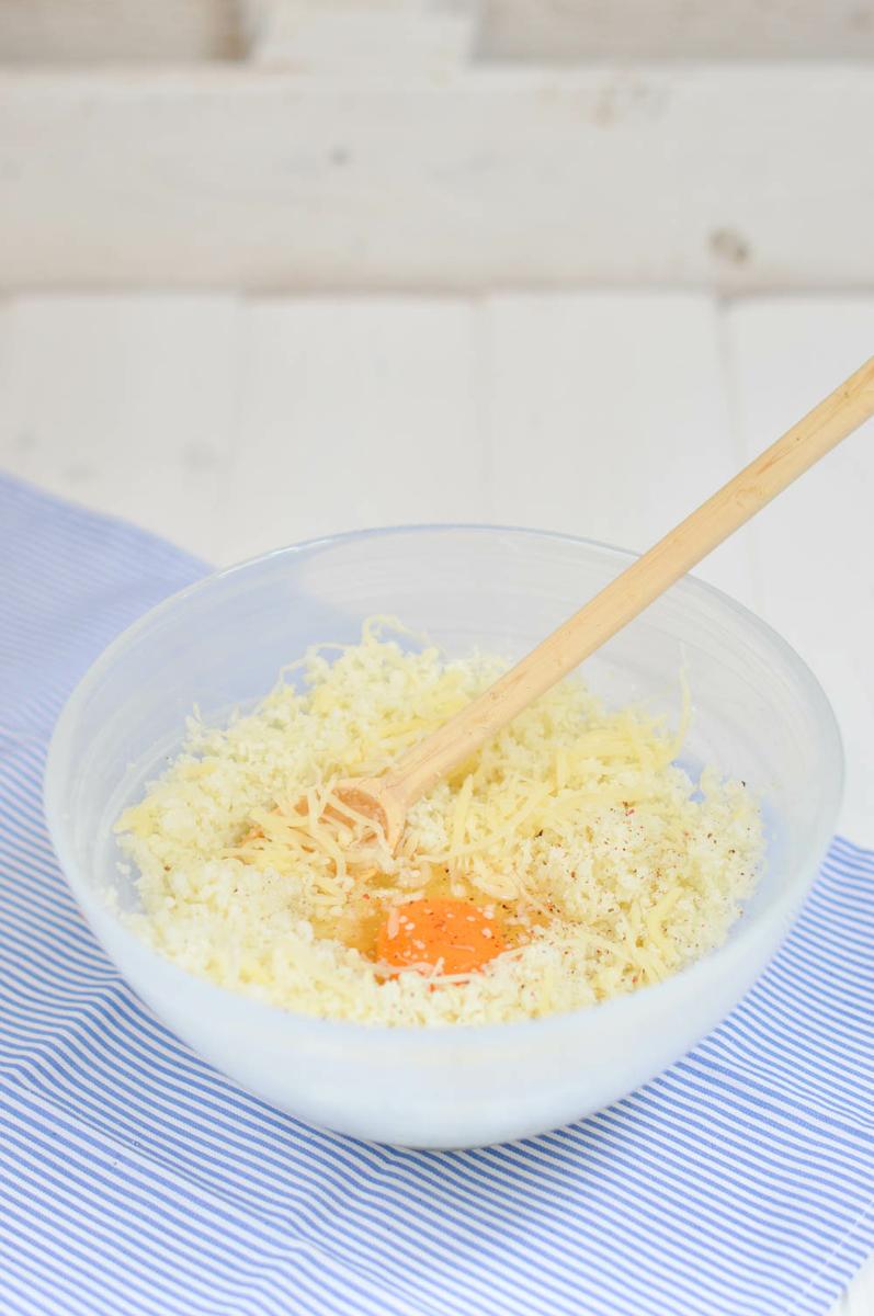 Ahora la ponemos un un bol y añadimos el huevo, un puñadito de queso rallado, pimienta y sal. Mezclamos todo bien.