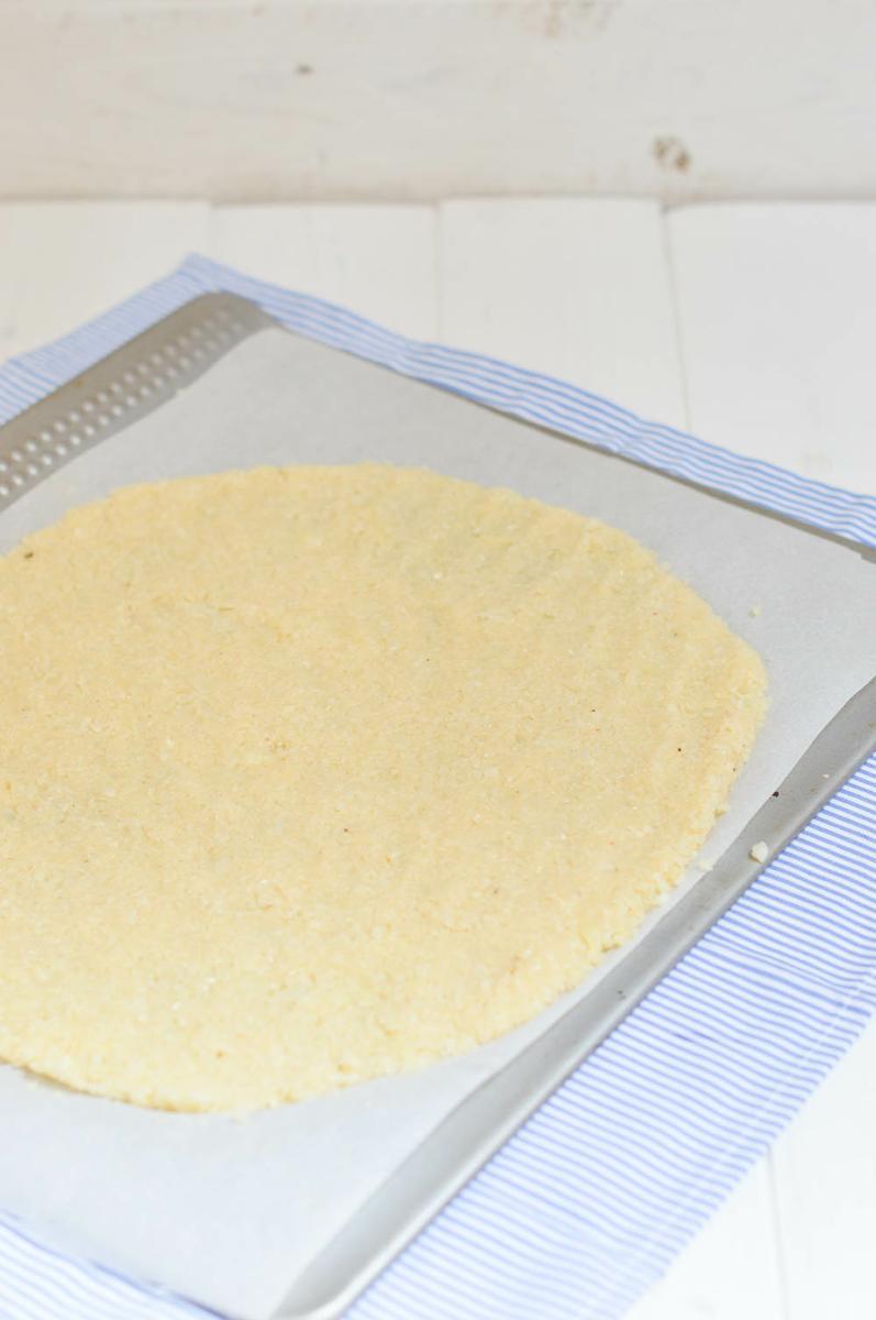 En la bandeja del horno ponemos papel vegetal y extendemos la mezcla de forma que quede lo más finita y uniforme posible. La llevamos al horno precalentado a 210º durante 30′.