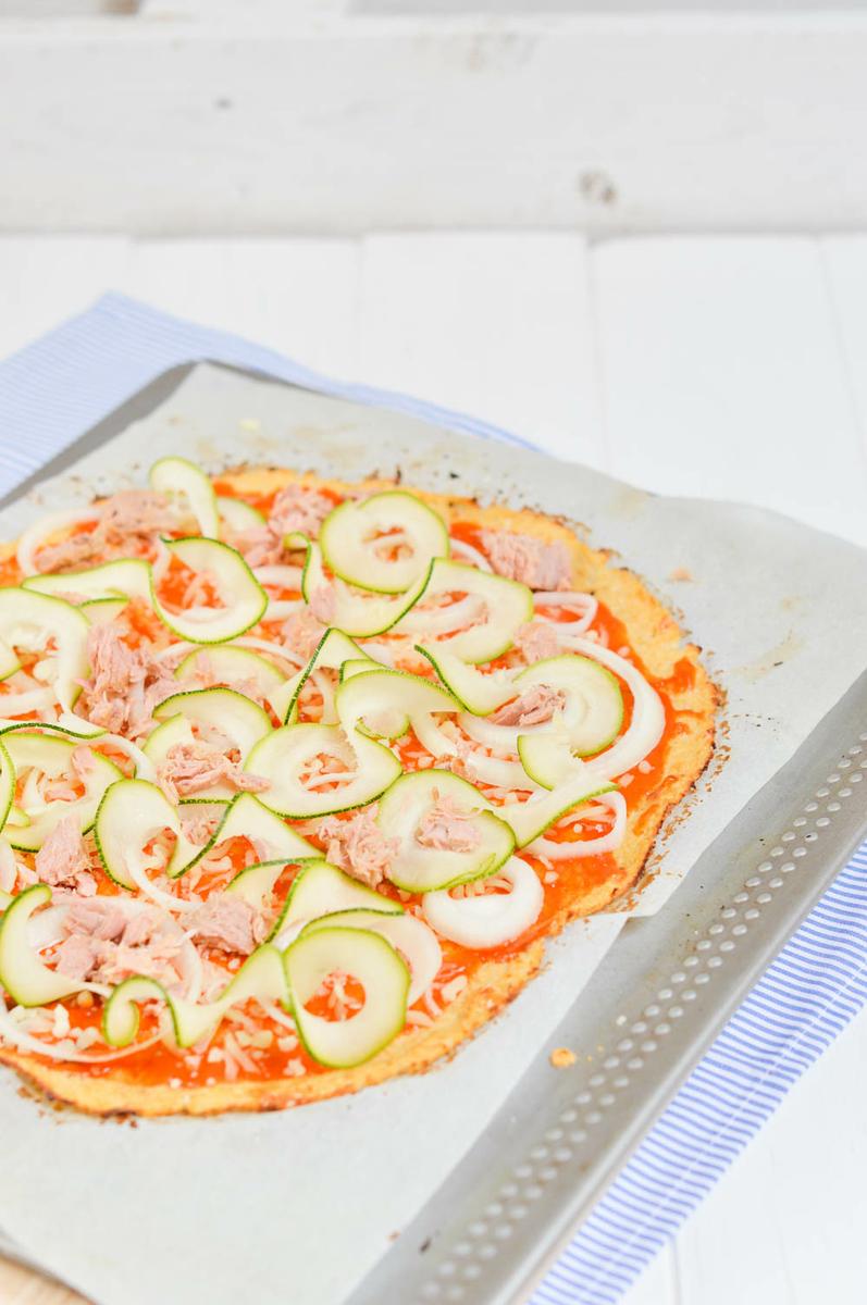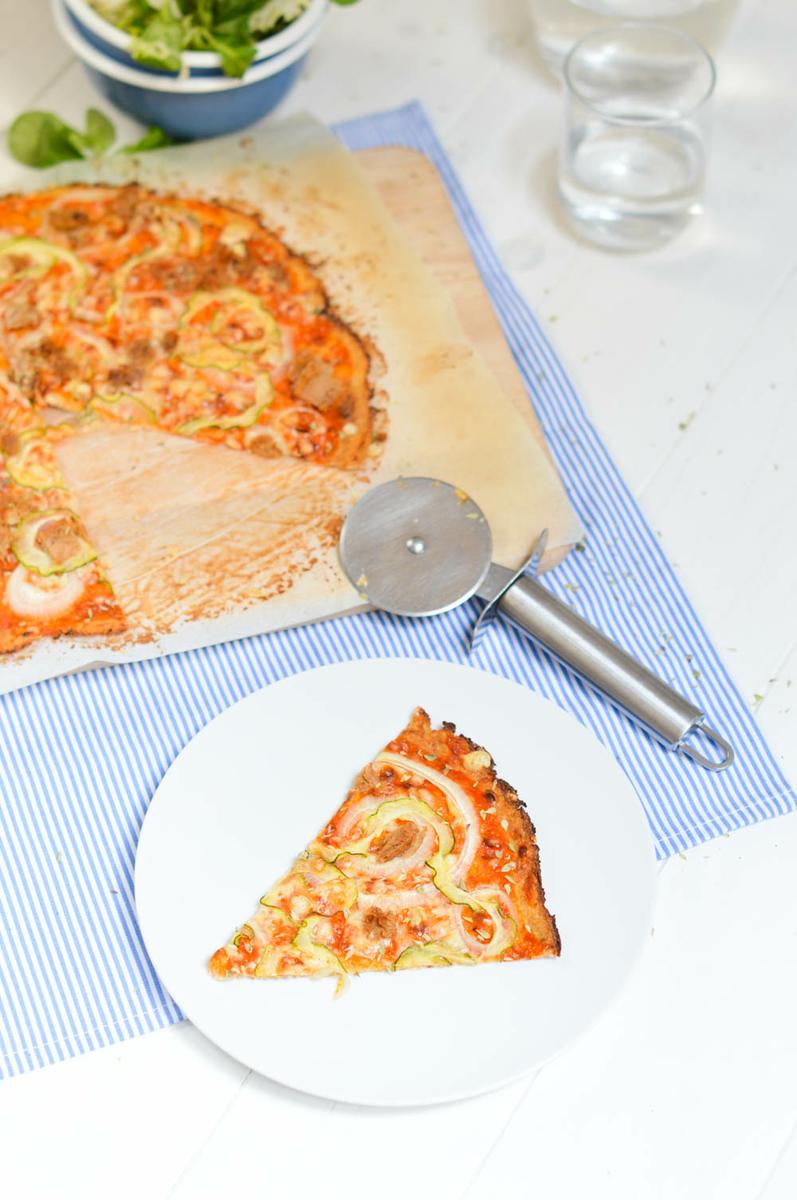 La masa en si como decíamos es bastante ligera, ahora bien, hay que tener cuidado en que no se nos vaya de las manos lo que le pongamos a la pizza por encima claro…Nosotras hemos optado por un poco de queso light, atún al natural, cebolla y calabacín, ligera no?