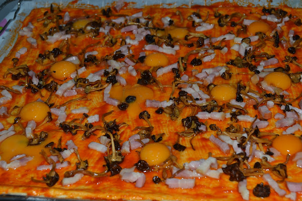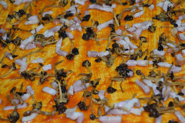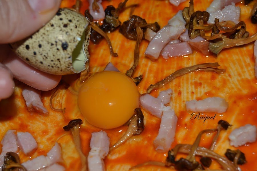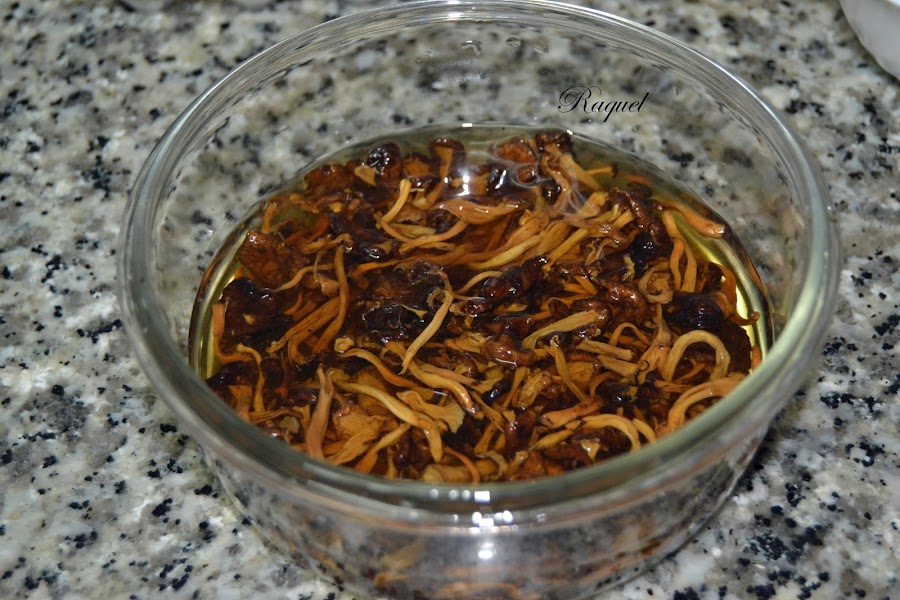 Se acaba la temporada de setas con el frío, pero como yo siempre tengo en conserva o deshidratadas como en este caso, la pizza de hoy lleva Camagrocs , estos aun son del año pasado, este año no ha sido muy bueno para esta especie Camagros (trompeta amarilla) (cantharellus lutescens).