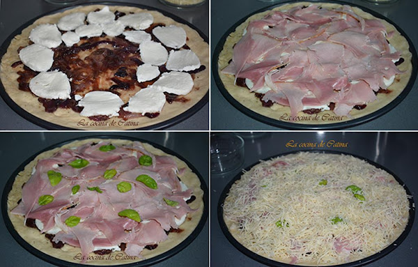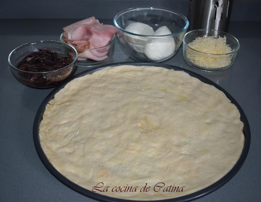 Extendemos la masa, la pintamos con aceite de oliva y espolvoreamos de pimienta. Cubrimos con la cebolla caramelizada, ponemos por encima rodajas de mozzarella, el jamón y las hojas de albahaca. Por último cubrimos la pizza con el queso mozzarella rallado.