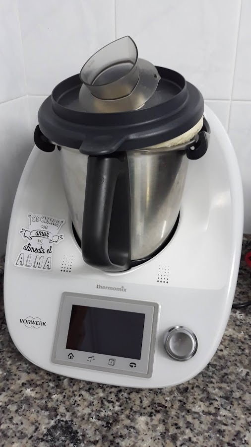 Así la hice yo con Thermomix, ponemos en el vaso el agua y deshacemos la levadura añadimos la miel, procurando echarla a un lado y no sobre las aspas, si no se quedara hay pegada, programamos 1 min./ 37º/ vel. 2.