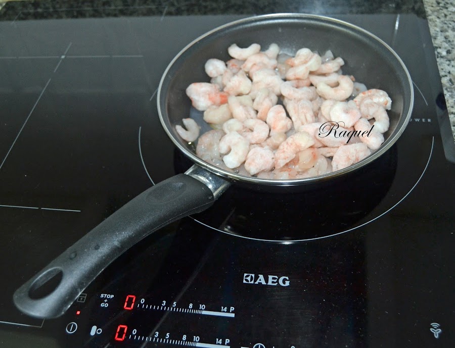 Ponemos en una sárten con un poco de aceite de oliva a freír las gambas, yo las meto congeladas y les pongo sal, las sofrío hasta que están hechas.