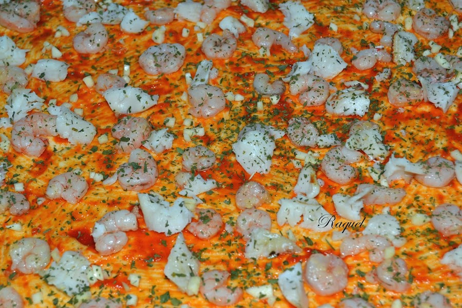 Hoy toca pizza, ya sabéis como todos los viernes en mi casa y os traigo esta que hice la semana pasada, aprovechando unos trozos de merluza que hice a la plancha con salsa de aceite ajo y perejil a mediodía y sobraron, he preparado esta pizza con unos pocos mas ingredientes.