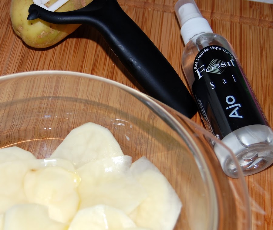 Pelamos la patata y la cortamos en finas lonchas, las ponemos en un recipiente apto para microondas y las regamos con el aceite ,las ponemos 3 minutos a potencia media, pulverizamos con la sal líquida y extendemos las lonchas de patata en la pizza sobre el queso,