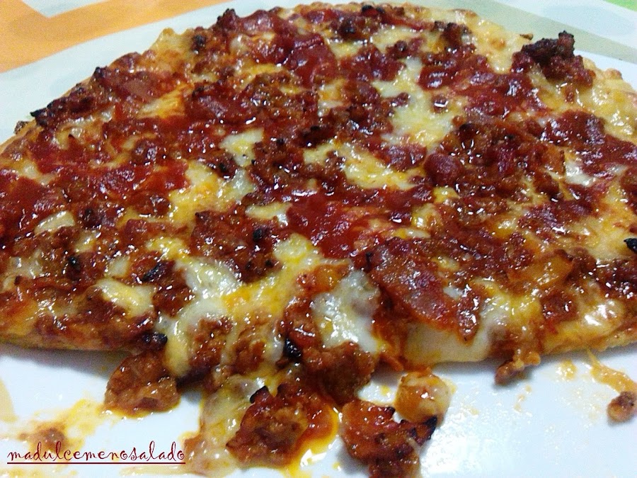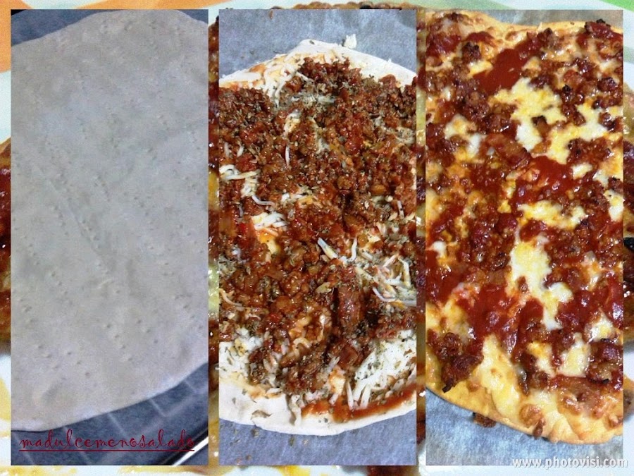 Sacamos del horno y ahora pues toca ya terminar de hacerla. Poner mozarella o mezcla de quesos para pizza, encima la carne con salsa brava que hemos echo, y por ultimo un poquito de orégano.