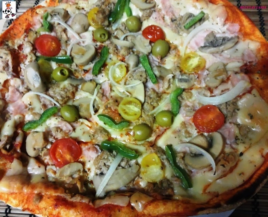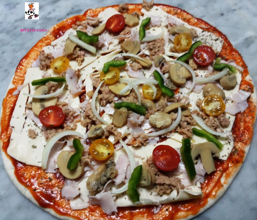 Ponemos dos cucharadas de tomate frito y untamos en la masa,ponemos las lonchas de queso cubriendo toda la masa. Añadimos el atún,las aceitunas,jamón cocido troceado,los champiñones,los tomatitos cherrys, la cebolla y el pimiento verde en juliana. Espolvoreamos orégano. Metemos la pizza en el horno a 200º unos 15min.