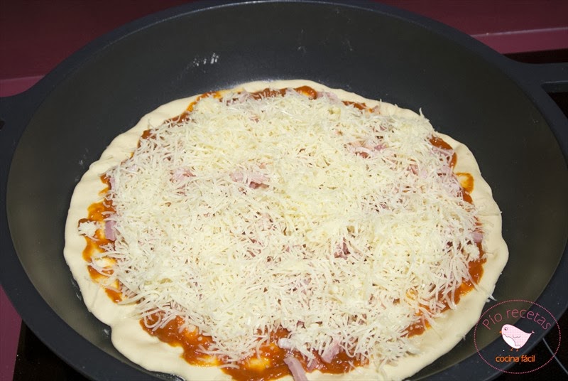 Si veis que se os rompe la masa al pasarla a la olla podéis ponerla sin extender en la olla e ir estirándola con la mano o con un rodillo pequeño hasta que obtengamos el tamaño deseado.A mi me salió una pizza de unos 30 cm con estas cantidades.Ponemos el tomate en la masa,el bacon y el queso.