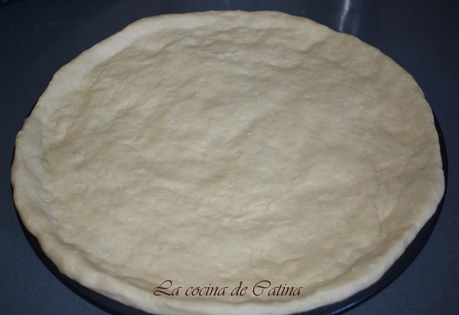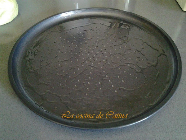 Nos untamos las manos con un poco de aceite y sacamos la masa del vaso, la estiramos con las manos sobre el molde dejándola muy fina o podemos estirarla sobre una mesa con un rodillo. La masa debe cubrir todo el molde como nos muestra la foto.