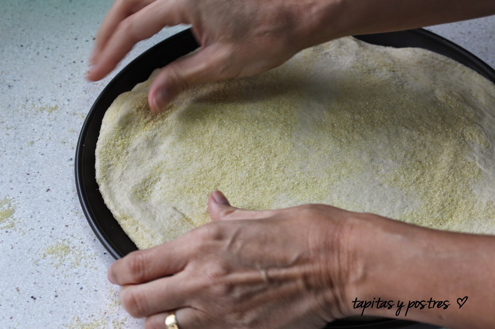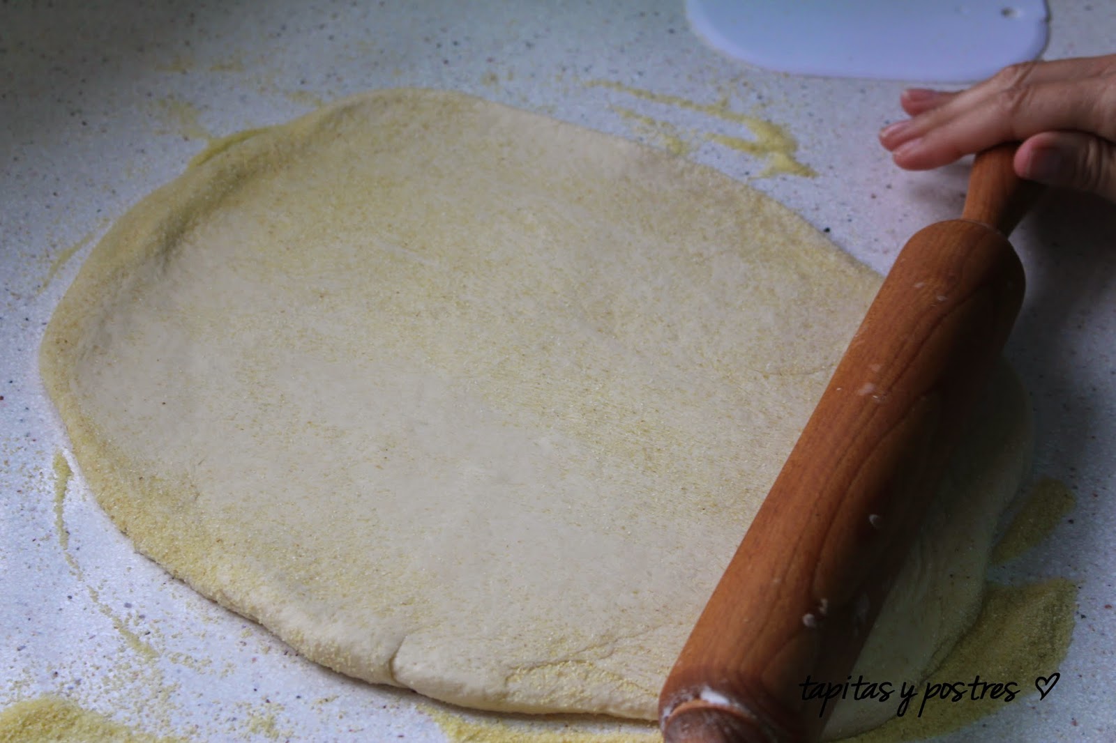 La estiramos esparciendo la sémola de trigo por toda la encimera. Damos forma redonda y hacemos hincapié en los bordes, para dejarlos más gorditos aplastando bien el centro de la masa.
