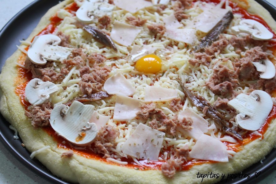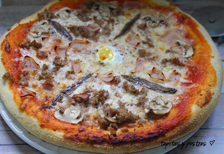 Tomate frito, mozzarella rallada, jamón cocido, atún, anchoas, champiñones...al gusto.