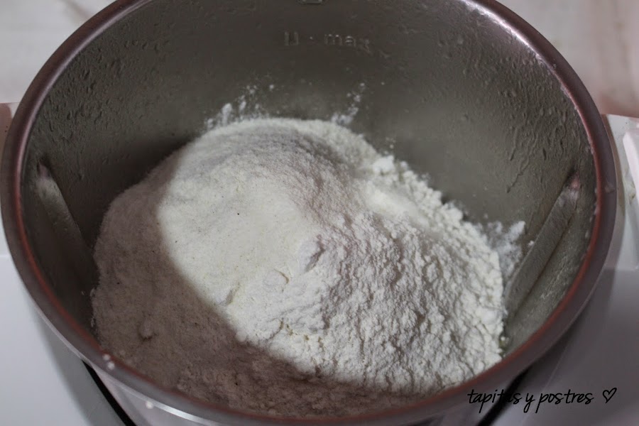 Incorporamos la harina de fuerza, la harina de maíz precocida y la sal. Amasamos 3 minutos, velocidad espiga.