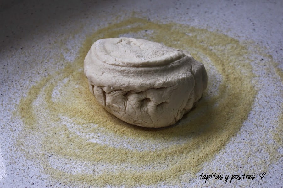 La estiramos. dando la vuelta a la masa, para que se quede la sémola por los dos lados. Damos forma redonda.