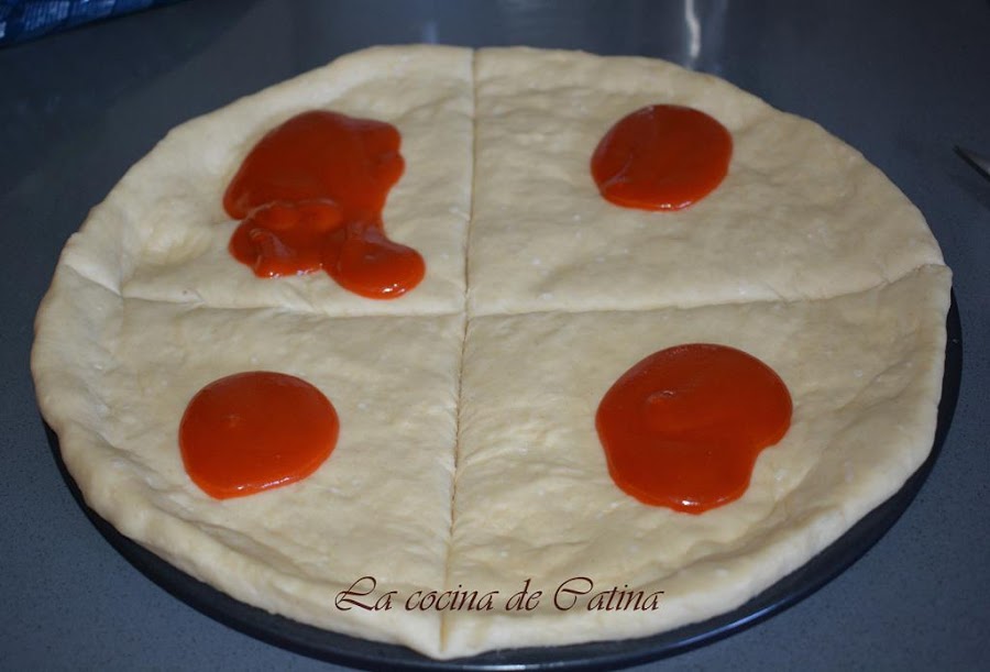 Marcamos 4 triángulos sobre la masa y colocamos los ingredientes de forma decorativa, primero la cubrimos toda con el tomate (se puede utilizar tomate crudo en rodaja finas).