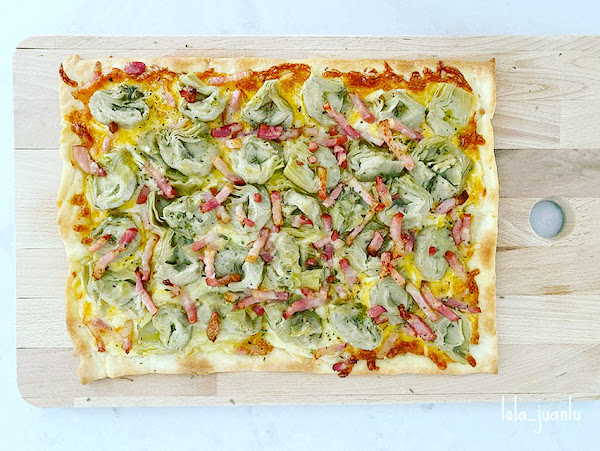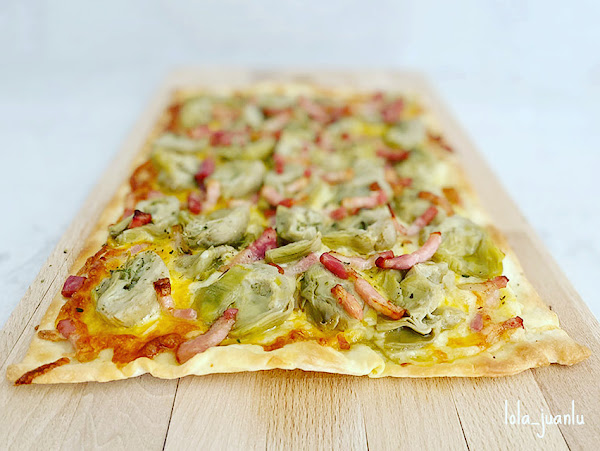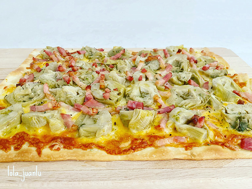 Extendemos la masa y la colocamos sobre una bandeja de horno. Espolvoreamos el queso rallado dejando 1 cm alrededor sin cubrir. colocamos las alcachofas sobre la capa de queso. Y, por último, distribuimos las tiras de bacon de forma decorativa.