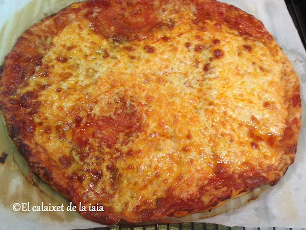 Un ratito antes de ir a preparla, sacaremos la masa del frigo, para que coja temperatura ambiente. La desenrollaremos y cubriremos con tomatre frito casero, la diferencia entre usar cualquier tomate envasado, y el tomate frito casero...es MUY grande.