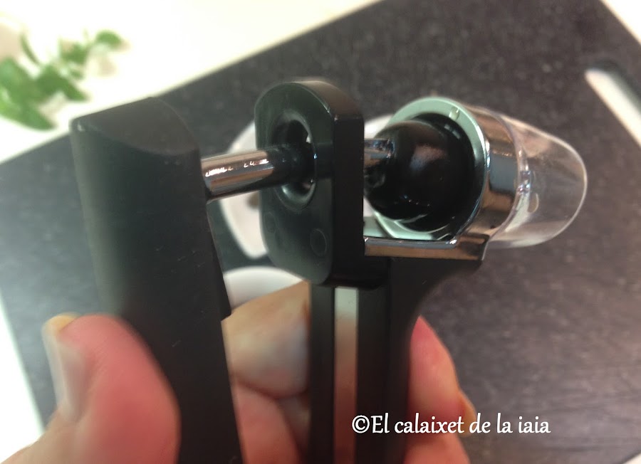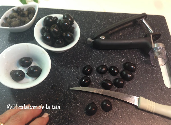 y con una simple presión, aceituna deshuesada. Aunque si no tenéis deshuesador (aunque merece la pena porque es barato), se pueden deshuesar con un simple clip de papelería como podéis ver pinchando aquí http://calaixetdelaiaia.blogspot.com.es/2015/07/como-deshuesar-facilmente-cerezas-con.html